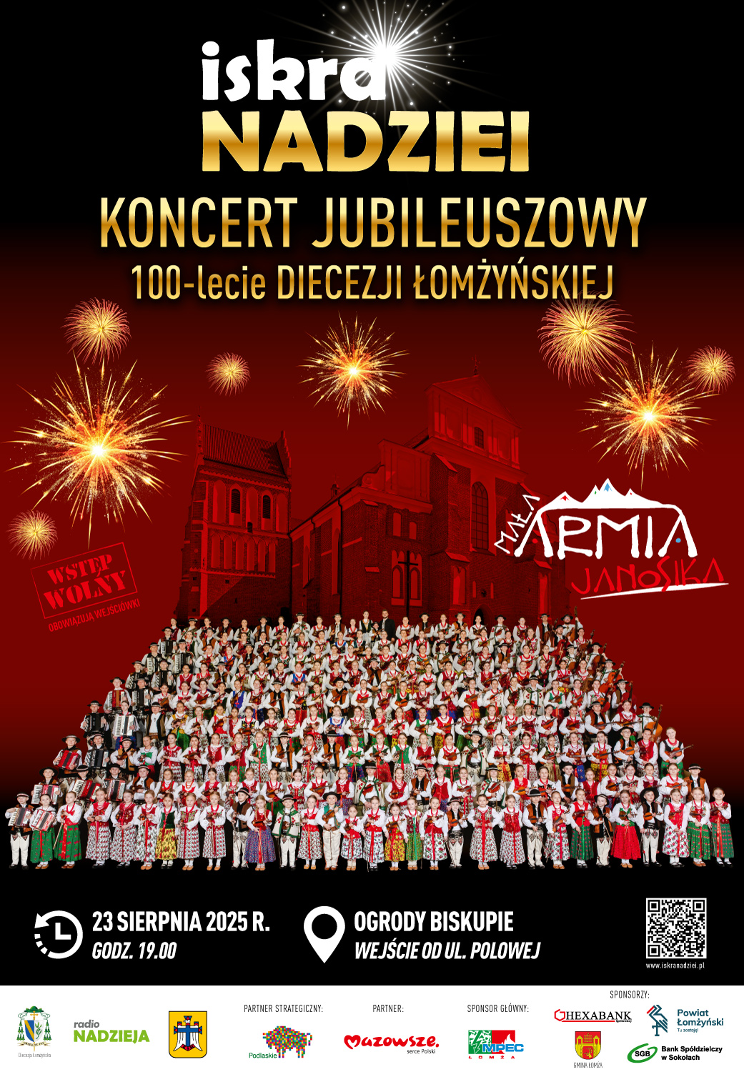 Fundacja Iskra Nadziei, Katolickie Stowarzyszenie Młodzieży Diecezji Łomżyńskiej oraz Radio Nadzieja zapraszają na kolejną edycję festiwalu „Iskra Nadziei”. W tym roku pragniemy uczcić jubileusz Diecezji Łomżyńskiej organizując wydarzenie pod nazwą „Iskra Nadziei – 100-lecie Diecezji Łomżyńskiej”. Przedsięwzięcie odbędzie się 23 sierpnia 2025 roku w Łomży. Do realizacji tegorocznego zadania zaprosiliśmy zespół „Mała Armia Janosika”, muzyczną grupę artystyczną, wykonującą muzykę folkową i ludową zainspirowaną góralską kulturą Podhala. Będzie to niezwykłe wydarzenie.