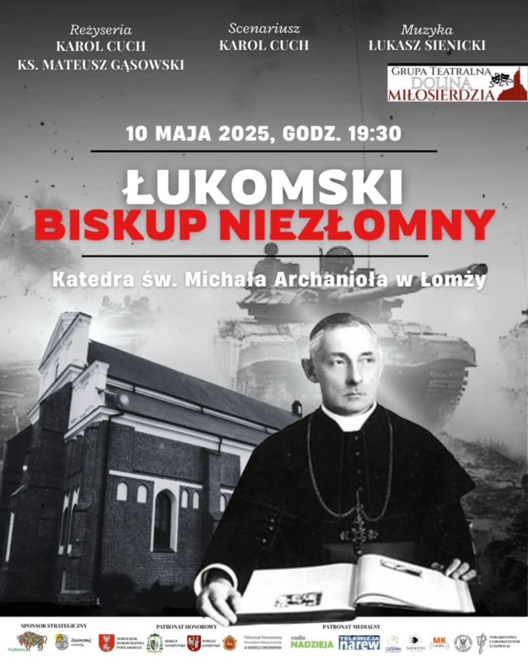 W sobotę 10 maja o godzinie 19:30 w naszej katedrze z racji obchodzonych jubileuszów stulecia diecezji łomżyńskiej i 500-lecia naszej katedry, odbędzie się widowisko teatralne pt. ” Łukomski – Biskup Niezłomny” opowiadający i ukazujący życie i losy biskupa łomżyńskiego Stanisława Kostki Łukomskiego oraz uratowaniu przez Niego naszej katedry w czasie II wojny światowej. Jest to dramat historyczny oparty na faktach który zostanie wystawiony przez Grupę Teatralną Dolina Miłosierdzia na czele z księdzem Mateuszem Gąsowskim z Sanktuarium Miłosierdzia Bożego w Łomży. Serdecznie zapraszamy