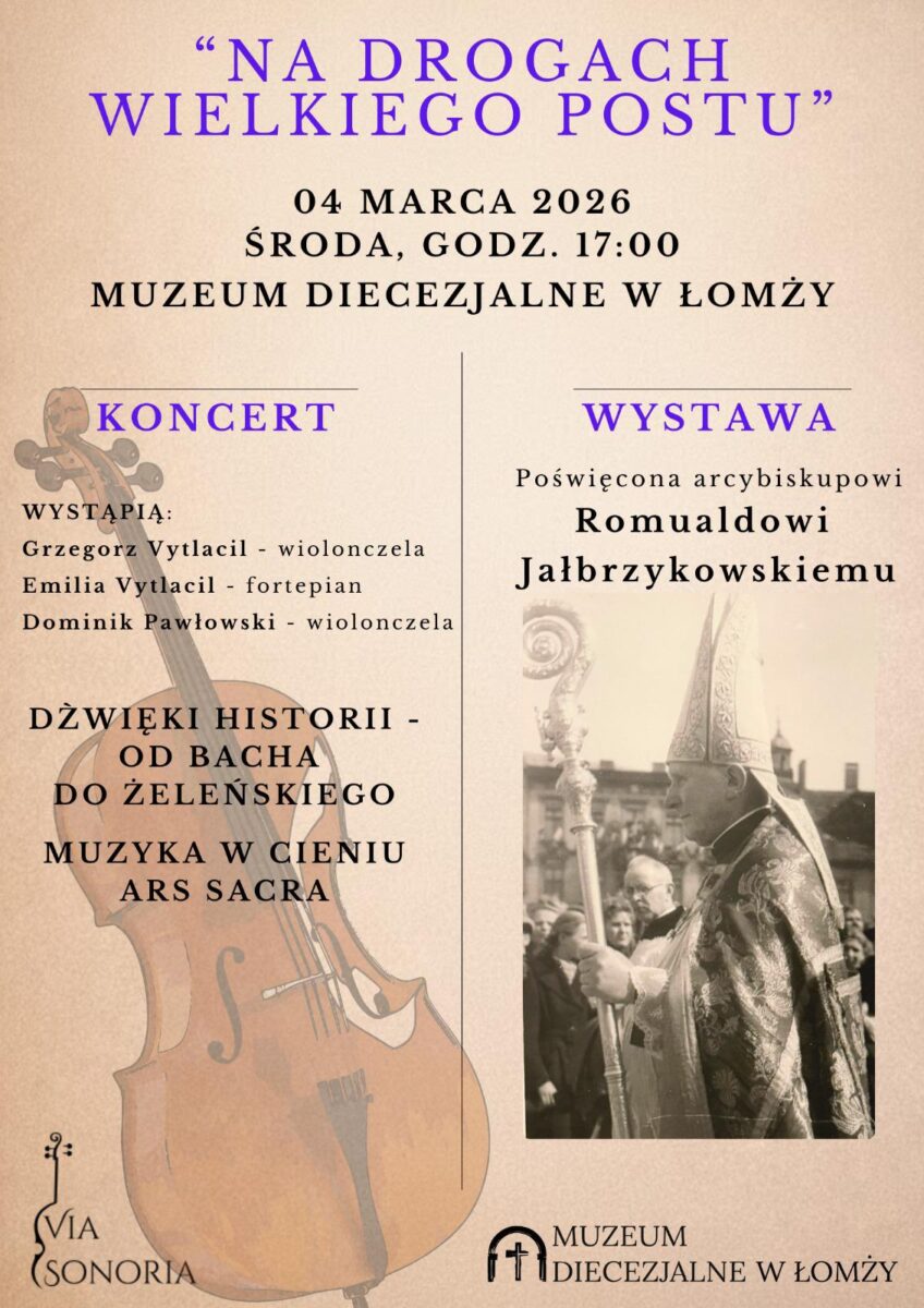 Muzeum Diecezjalne w Łomży zaprasza dnia 4 marca 2026 r. o godz. 17.00 na wydarzenie „Na drogach Wielkiego Postu”. W ramach spotkania odbędzie się koncerty „Dźwięki historii – od Bacha do Żeleńskiego. Muzyka w cieniu ars sacra” oraz nastąpi otwarcie wystawy poświęconej arcybiskupowi Romualdowi Jałbrzykowskiemu.
