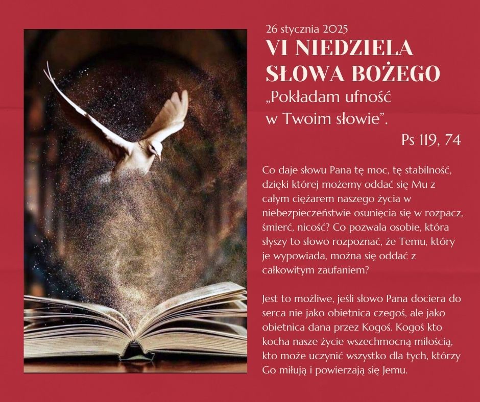 W niedzielę 26 stycznia 2025 roku w ramach Roku Jubileuszowego we wszystkich diecezjach świata będzie obchodzona VI Niedziela Słowa Bożego. Mottem na Niedzielę Słowa Bożego 2025, wybranym przez Ojca Świętego, jest werset 74. z Psalmu 119: „Pokładam ufność w Twoim słowie”.