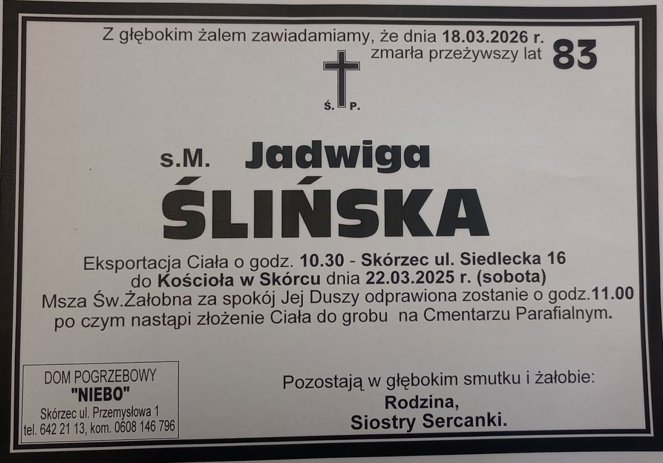 Kuria Diecezjalna w Łomży ze smutkiem i żalem powiadamia, że zmarła s. M. Jadwiga Ślińska, sercanka związana z diecezją łomżyńską, w której posługiwała w Kolnie (1976-1986) oraz Łomży (Wyższe Seminarium Duchowne, 1999-2003).