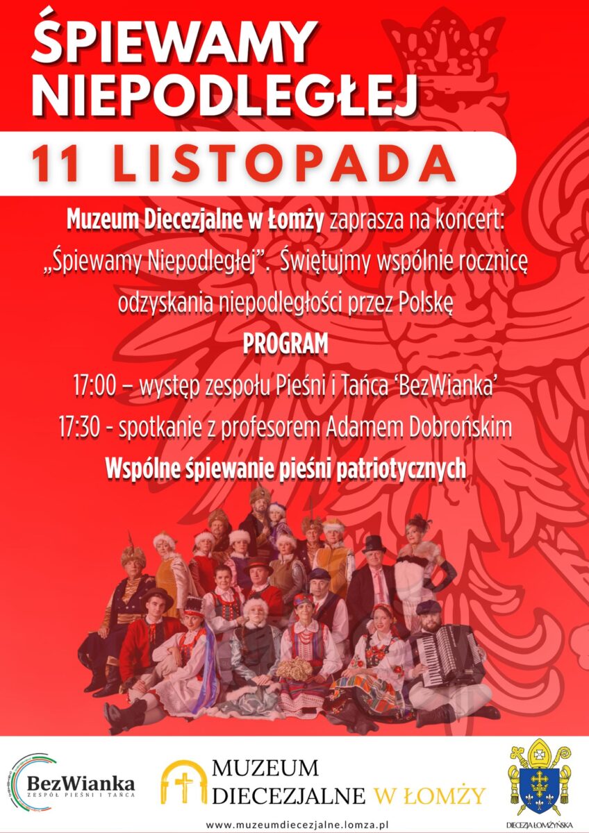 Muzeum Diecezjalne w Łomży zaprasza, już po raz trzeci, na koncert „Spiewajmy Niepodległej” organizowany z okazji odzyskania niepodległości przez Polskę w 1918 roku. W ramach wydarzenia, które odbędzie się dnia 11 listopada 2025 r. w siedzibie Muzeum Diecezjalnego (ul. Giełczyńska 20A, 18-400 Łomża) przewidziany jest o godz. 17.00 półgodzinny występ Zespołu Pieśni i Tańca „BezWianka”, następnie odbędzie się spotkanie z prof. Adamem Dobrońskim. Zwieńczeniem obchodów rocznicy odzyskania niepodległości przez Polskę będzie wspólne śpiewanie pieśni patriotycznych.